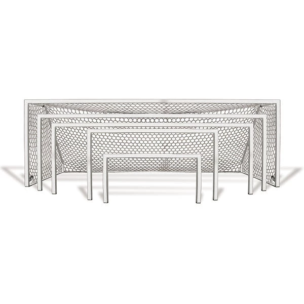 Golden Goals are sold complete and always include goal structure, backstays, ground bar, transport wheel kits, auger style ground anchors, and professional style hexagonal net.