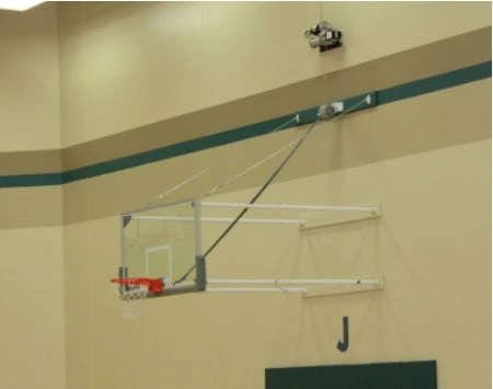 When choosing the right wall mount for your facility, there are several factors to take into consideration including: pre-existing structures or equipment, facility gymnasium space, condition of facility walls and budgetary constraints. We offer a full line of basketball wall mounts to customize your space for an optimal and safe play environment. Fold-Up Wall Mount Systems incorporate four-point attachment for backboards with 36″ x 63″ or 20″ x 35″ mounting centers. Stores compactly in vertical fold up position against wall to prevent interference with other court activities. In play position, unit locks into stationary four-point position. Offers a direct goal attachment when height adjuster is purchased. 4/0 upper safety chains with heavy malleable turnbuckles provide additional support. Telescopic design allows for complete adjustability and ease of installation. Structural wood mounting pads included. Mounting hardware provided by others. Board and goal are not included unless wall mount package is purchased. Height adjuster is optional. Safestop safety strap is optional. Requires either a manual winch or an electric hoist for operation – these will need to be purchased separately.