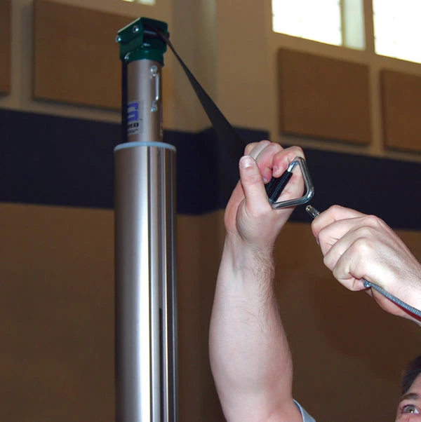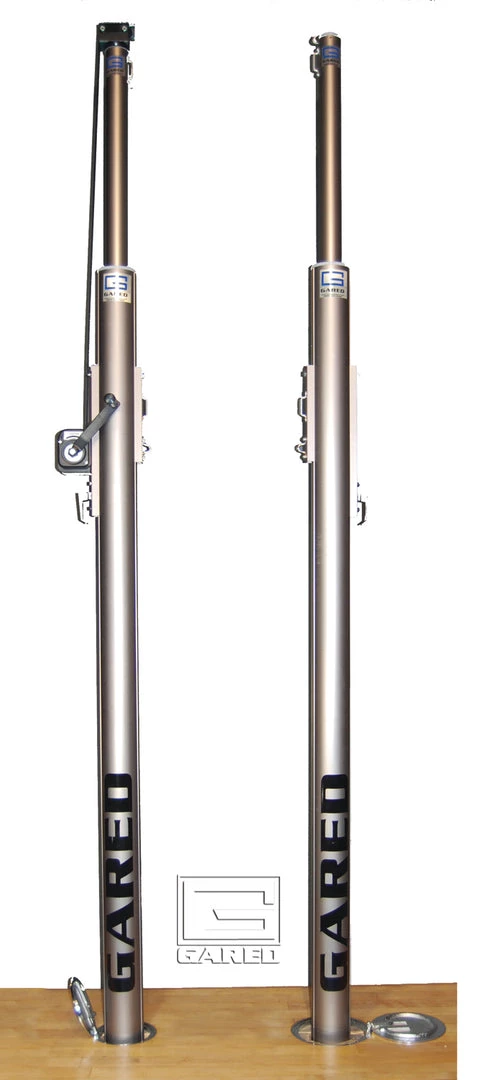 Top-of-the-line, premium LIBERO Master telescopic volleyball system designed for competition play. 4 O. D. telescopic uprights are constructed of a strong, yet lightweight, anodized extruded aluminum for superior support and long life. Features an internal spring assist guide which allows the telescoping posts to glide easily up or down for precise height adjustment without having to remove the net. Easy-to-operate ratchet winch sets net tension. New 3-point net attachment makes set up quick and easy . Height indicator decal includes Mens (7 11 5/8), Womens (7 4 1/8), and Juniors (7) net heights applied in the field to your facility conditions. Exclusive wedge lock holds sliding rail system securely. One, two, and three-court systems available. Meets USVBA, NCAA, and NFHS competition specifications. 10 YEAR LIMITED WARRANTY ON POSTS AND 3 YEAR LIMITED WARRANTY ON WINCH ASSEMBLY, LOCKING RAILS, FLOOR SLEEVES AND COVERS. 7300 SYSTEM FEATURES 1. Competition volleyball system with telescopic post 2. Telescopic design will keep net at top of post no matter what height off the floor 3. Heavy duty ratchet winch for smooth and easy net tension adjustment handle that folds for added safety 4. Cam lever with exclusive GAREDĀ® wedge lock design holds net securely with no creeping 5. Internal spring assist to easily adjust the telescopic post 6. Lightweight 4 O. D. aluminum posts with inset grooves for added strength.