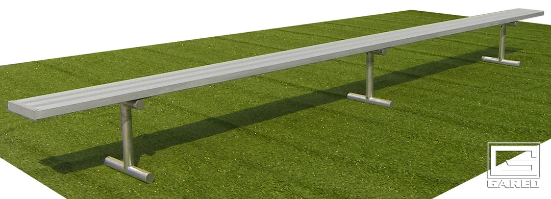 Heavy-duty Aluminum Benches provide affordable, low-maintenance seating for players and fans. Seats are comprised of 10″ wide anodized aluminum planks. Frames are constructed of heavy-gauge galvanized steel for maximum support and years of use. Available in 7′ 6″, 15′, 21′ and 27′ lengths. All sizes and styles available in portable, inground or surface mount installation methods.