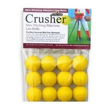 Lightweight and soft, these Trend SportsĀ® Crusher Mini-Lite Balls are the size of a golf ball but can be hit in the garage, backyard, gym or at the ball park. The balls are colored optic yellow and formed to look like miniature pitching machine baseballs. The balls are great for developing hand/eye coordination and perfecting your swing at home.