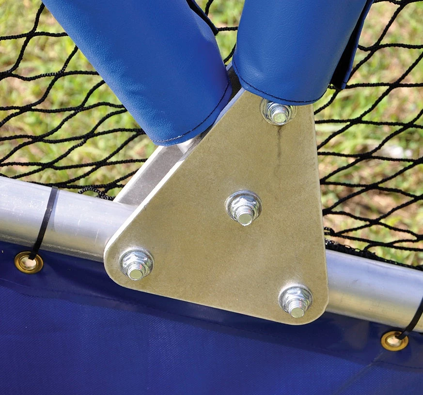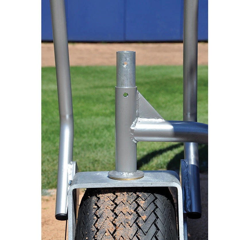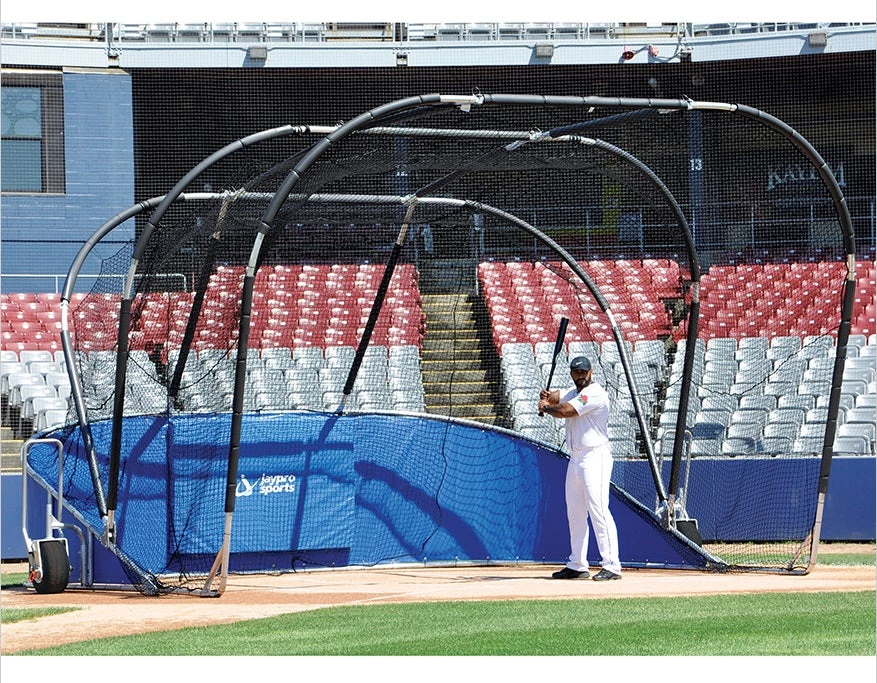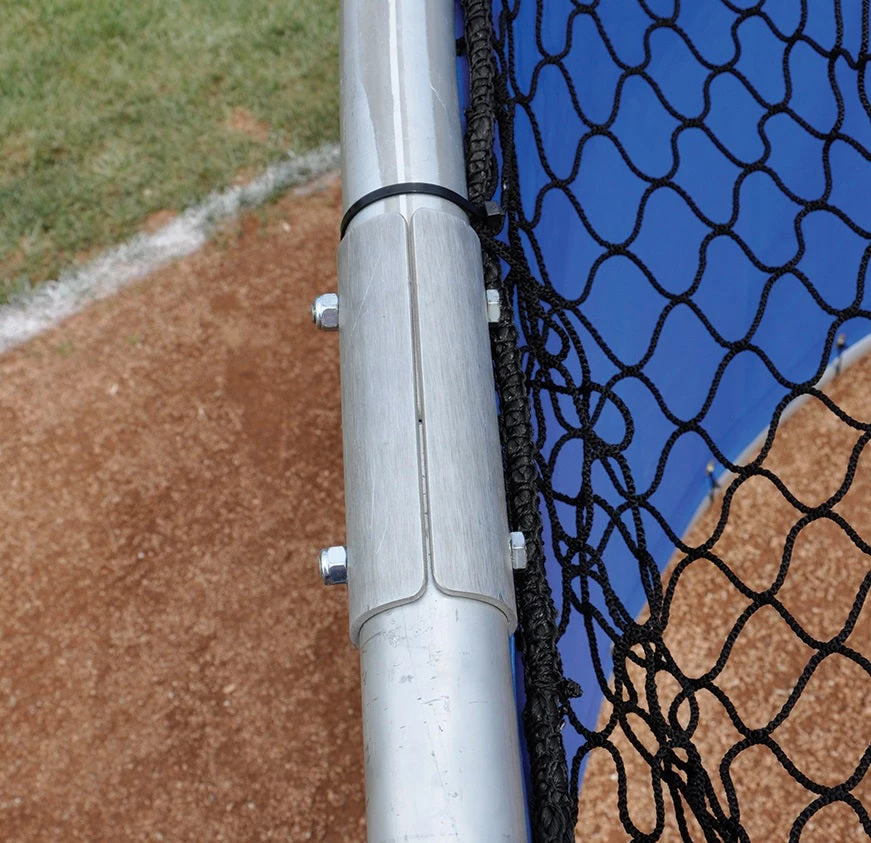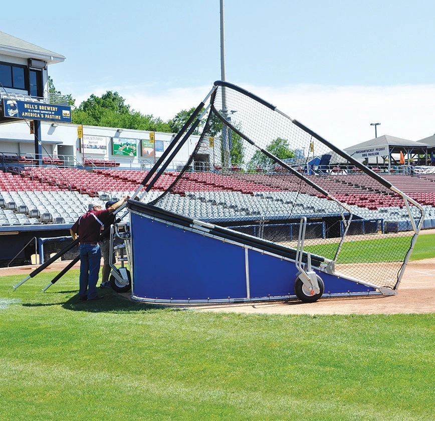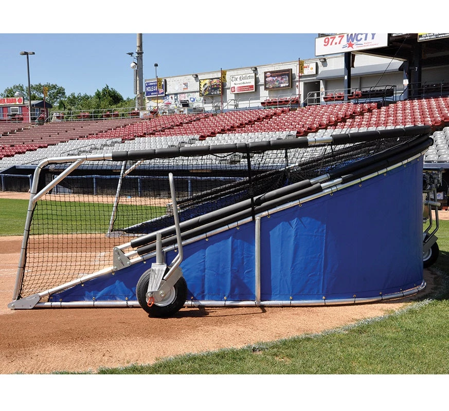 Heavy-duty portable batting cage with swivel side wheels and handles allows for easy transportation or movement on and off the field.