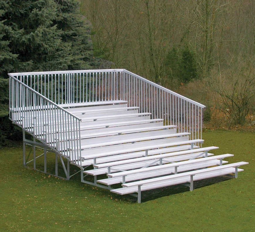 Heavy-duty enclosed bleacher. Vertical guard rail on side and back encloses the bleachers for safety. Dual braces and rear stabilizing bar added for increased strength.