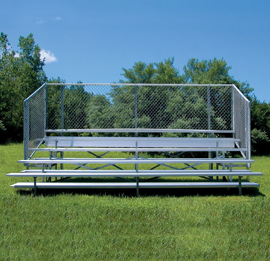 Heavy-duty enclosed bleacher. Chain-link fence on sides and back encloses the bleachers for safety. Dual braces and rear stabilizing bar added for increased strength.