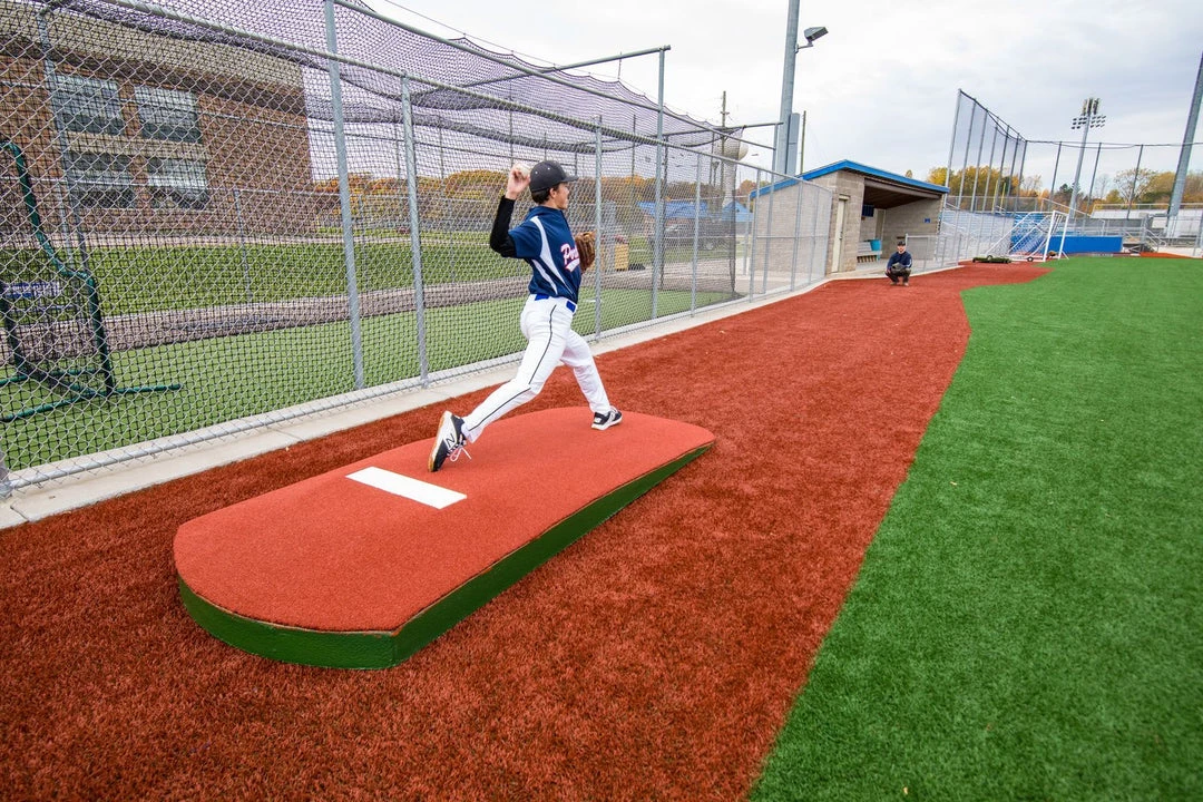 Portolite’s NEWEST Practice Portable Pitching Mound is perfect for batting practice, bullpens, athletic facilities, and gymnasiums. The full body, high performance poly protected resilient core construction gives pitchers a solid yet cushioned landing area reducing knee and ankle strain. The poly coating grips gymnasium floors without scratching. Practice mounds come with the most durable turf and is available in Clay, Red, and Green colors. Simulated rubbers last 10 times longer than industry standards.