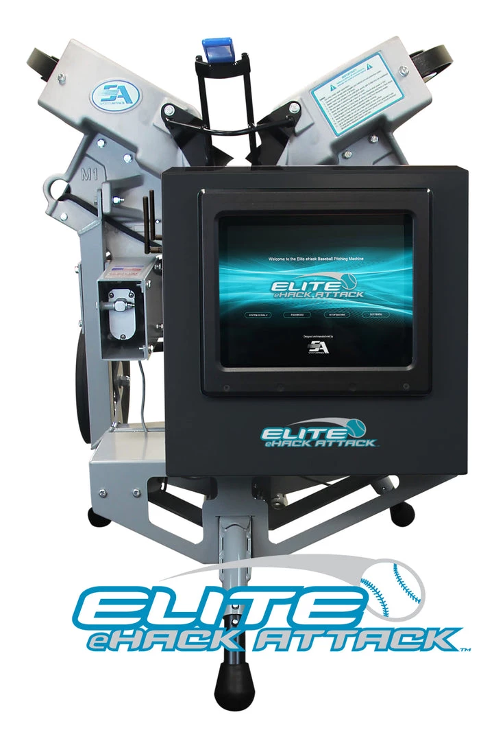 - The Elite eHack Attack has a unique three-wheel design that allows you to see the ball clearly and fully all the way through the feeding motion, acceleration and release, just like a live pitcher. With this design, the hitter sees when to stride and the angle of release, giving him an actual live-arm sense of timing and location.