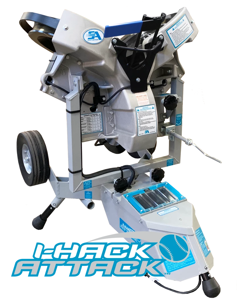 - The I-Hack Attack pitching machine quickly moves on and off the field by just tilting it, un-socketing the legs and easily rolling it on two heavy-duty transporting wheels (not the throwing wheels).
