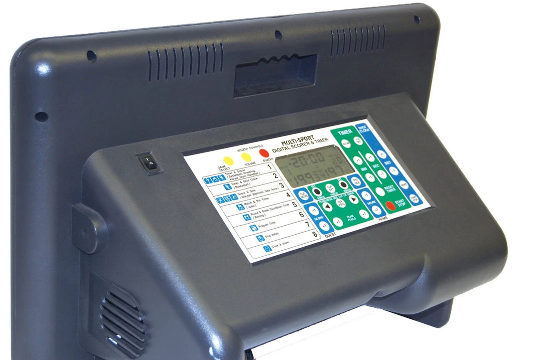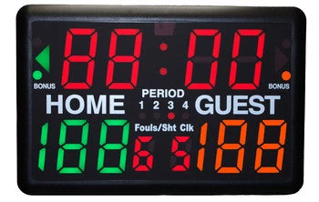 Clock, stopwatch & timer program with alarm Built-in carry handle for easy transport. Bright LED lights. Clock numbers 5″high & score numbers 4″high. Scores up to 199. Time counts up or down to 99:59 minutes and 1/10th of a second timing in last minute. Includes period, bonus and foul indicators. 15ft power cord. Lightweight design for easy transport. Now Includes FREE Wireless Remote!