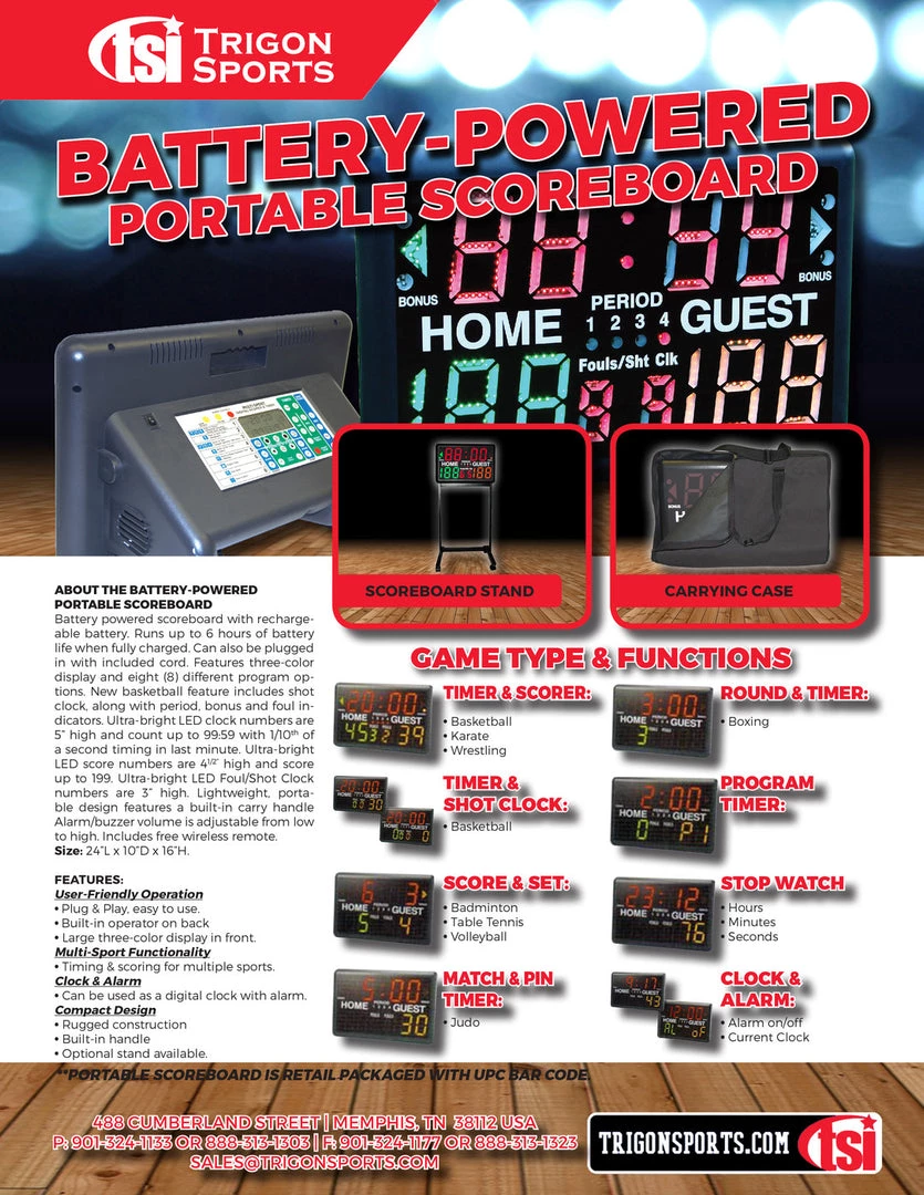 Great for basketball, wrestling, volleyball, and many other sports. Battery operated scoreboard with rechargeable battery. Up to 6 hours of battery life when fully charged. Can also be plugged in with included cord. Features all the same timer and game functions as our item # SCORE.Ā