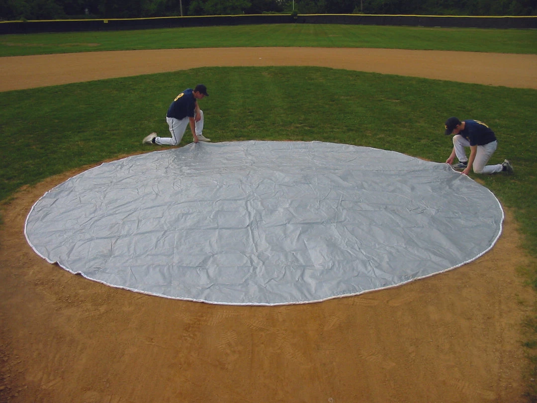 6oz poly material with weighted hems that allow covers to stay in place without stakes or sandbags. Silver / white color.