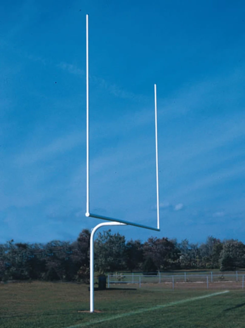 DescriptionThis football goal post offers semi-permanent/permanent single post slingshot design that meets all NFHS specifications with a crossbar measuring 23′ 4″. Painted all white. Features Offset is 5′ Main upright and crossbars are 4-1/2″ O.D. galvanized steel Uprights are 2-3/8″ aluminum powder coated, 20′ high Galvanized and painted gooseneck Fully adjustable in two directions insures crossbar is perfectly level and uprights are vertically plum All goal posts sold in pairs and ship by truck Ground Sleeves Available (FBGPGS)