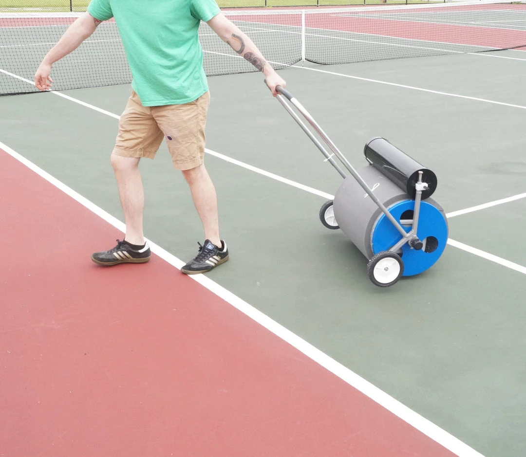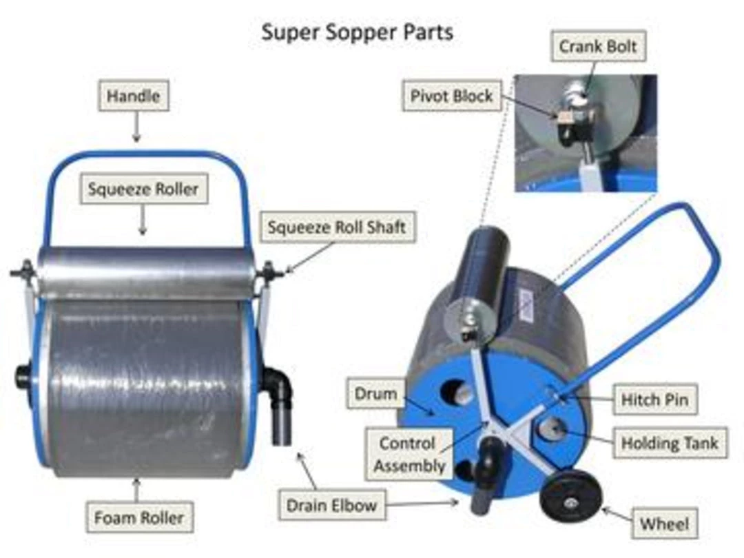 Pick up water and carry it away from any playing surface. Sensational on grass, tennis courts or artificial turf. The Mackerel will prevent cancelled events and reduce turf damage. A foam pad on the outside absorbs the water which is squeezed into a 7 gallon suspended holding tank by an adjustable top roller. To empty simply turn the drain elbow down. Unit measures 2â wide with a 15â diameter drum.
